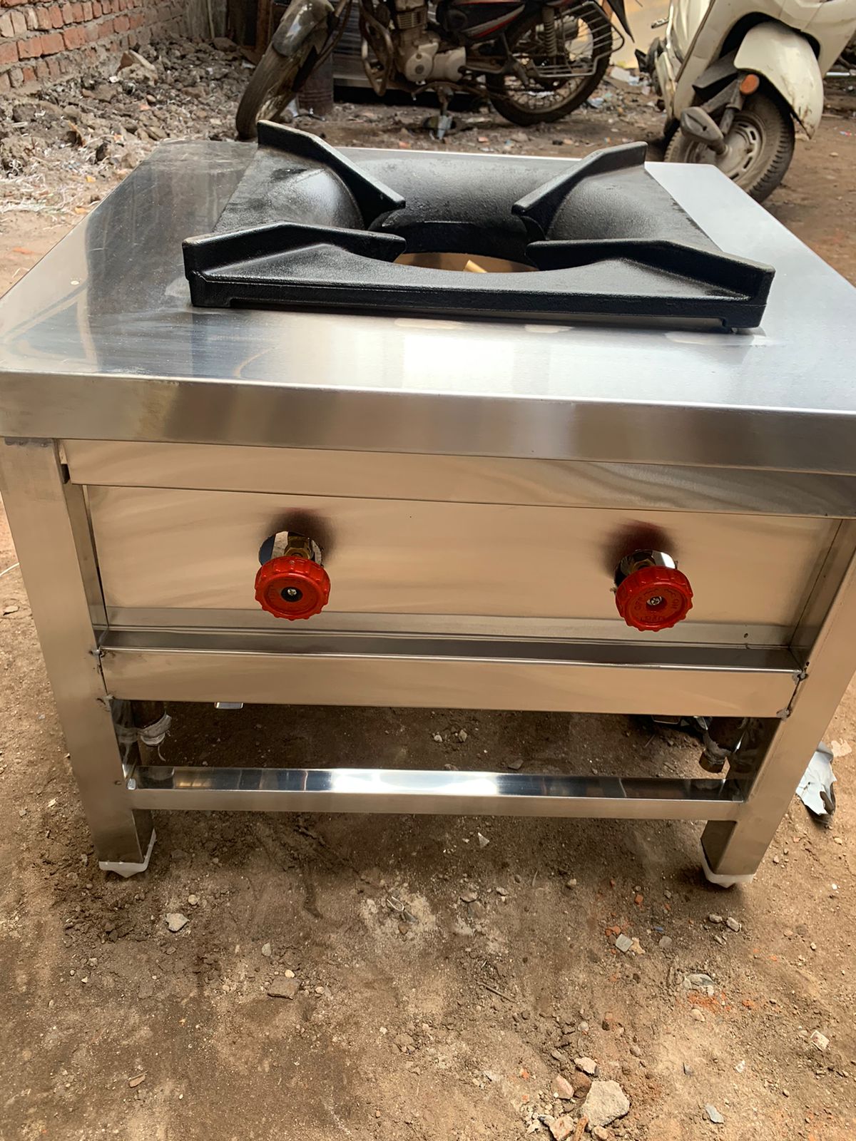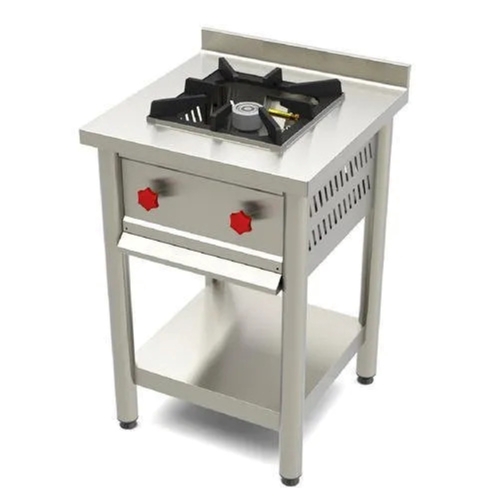 The under-shelf provides extra storage space for utensils or ingredients, maximizing kitchen efficiency. Designed for high-flame Indian cooking, this burner is suitable for hotels, restaurants, dhabas, cloud kitchens, and catering setups.